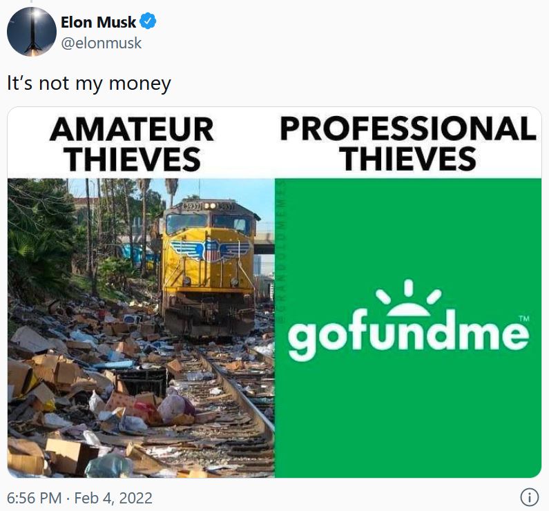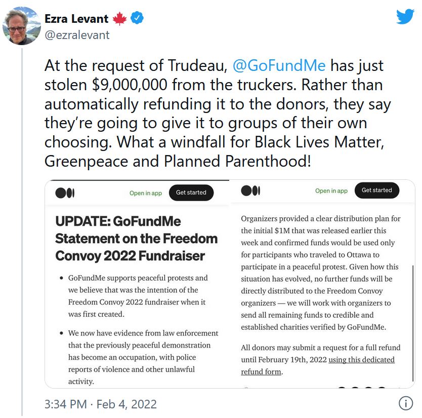 GoFundMe outrageously removed the Canadian Truckers Freedom Convoy (protesting vaccine mandates) fundraiser after 10 million dollars had been donated. GoFundMe's cover excuse was that the fundraiser violated GoFundMe's selectively enforced 'terms and conditions', specifically 'violence and other unlawful activity'. 100% PURE HYPOCRISY: Keep in mind that GoFundMe allows fundraisers for cop killers, and allows fundraisers for Black Lives Matter, despite the fact that BLM has caused 1 - 2 billion dollars in damage across 20 states from 5/25/2020 - 6/8/2020. 16,241 were arrested. 2,037 police officers were assaulted or injured. 1 police officer was killed. GoFundMe then outrageously announced that they intended to divert the Canadian trucker money to other causes of their choosing. It wasn't until Ron DeSantis threatened a fraud investigation of the company, that GoFundMe agreed to simply refund the donors. The Canadian truckers were still denied their funds. A new fundraiser was later started on GiveSendGo.com (from our list of alternative fundraising sites below).