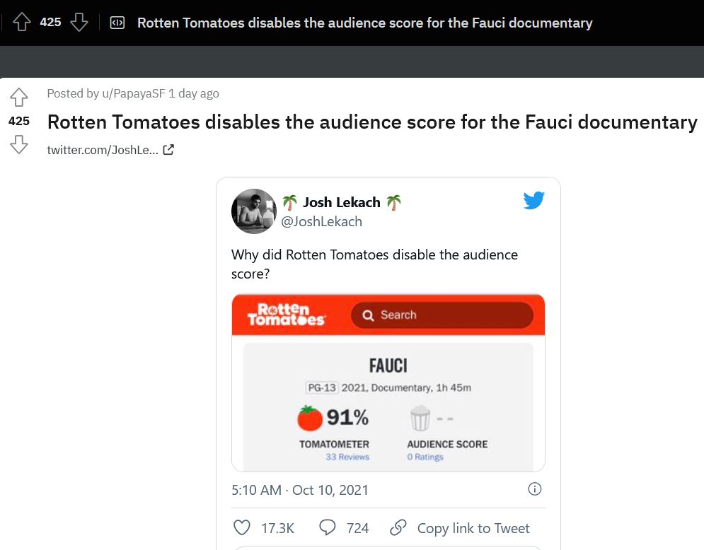 RottenTomatoes - Disabled audience score for Fauci propaganda movie.