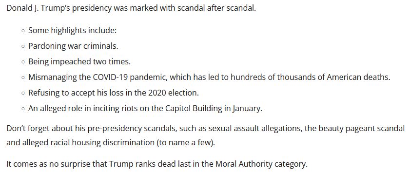 MoneyWise - Ran a click-bait article called "25 worst presidents". Of course they bashed Trump based on DNC and media fabricated 'scandals' and allegations, opinion, and selective outrage. Of course, neither Clinton, Obama, Biden, or Carter made their left-wing list.