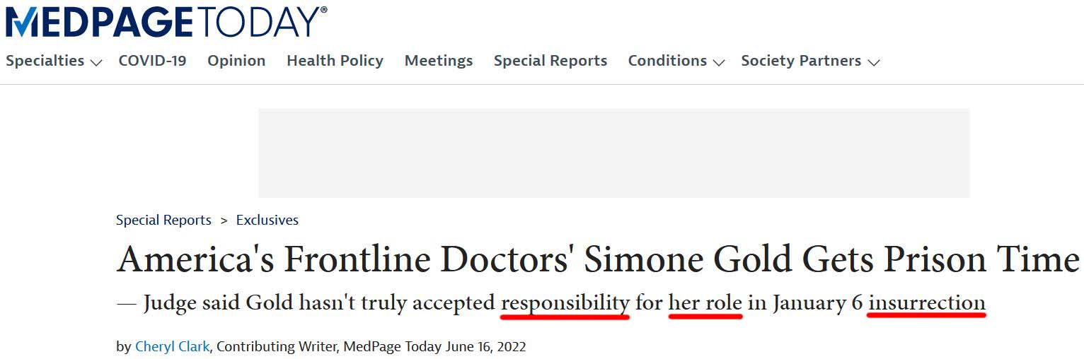 BELOW: MedPage falsely associating Dr. Simone Gold as having participated in an 'insurrection'. Nobody has been charged with insurrection. NOBODY.